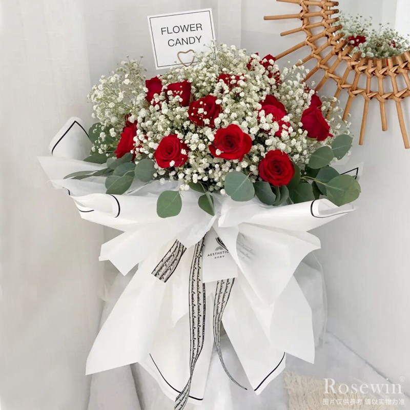 11朵红玫瑰,丰满白色满天星、圆叶尤加利叶装饰