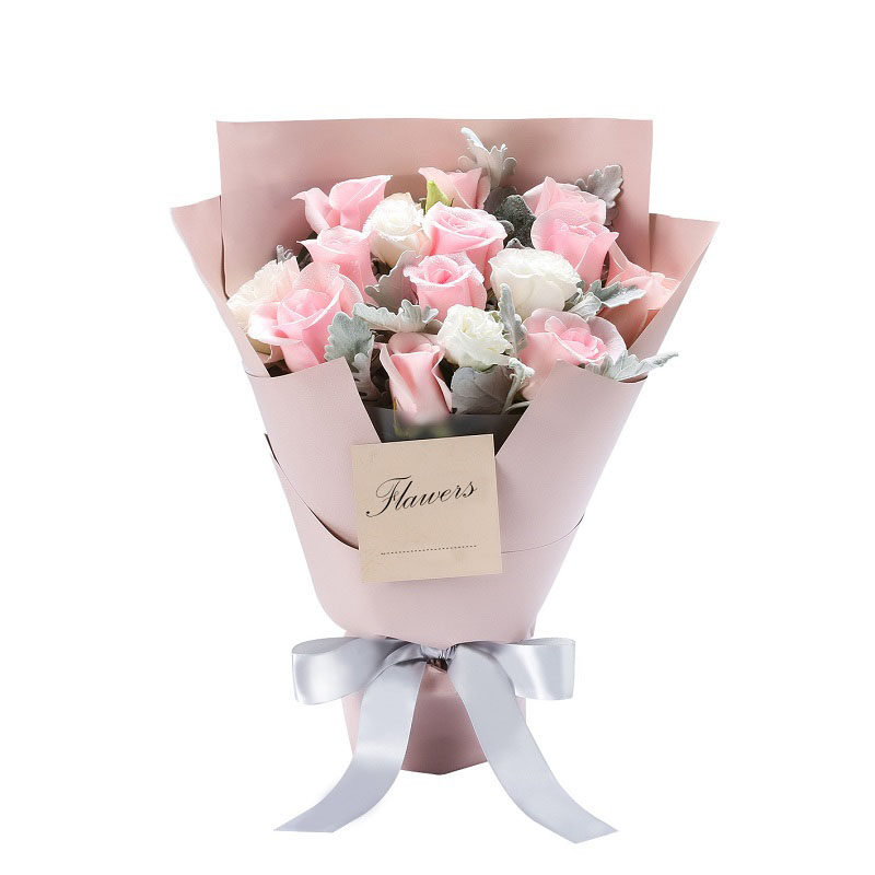 11朵粉玫瑰+2支白色洋桔梗,搭配适量银叶菊装饰。
